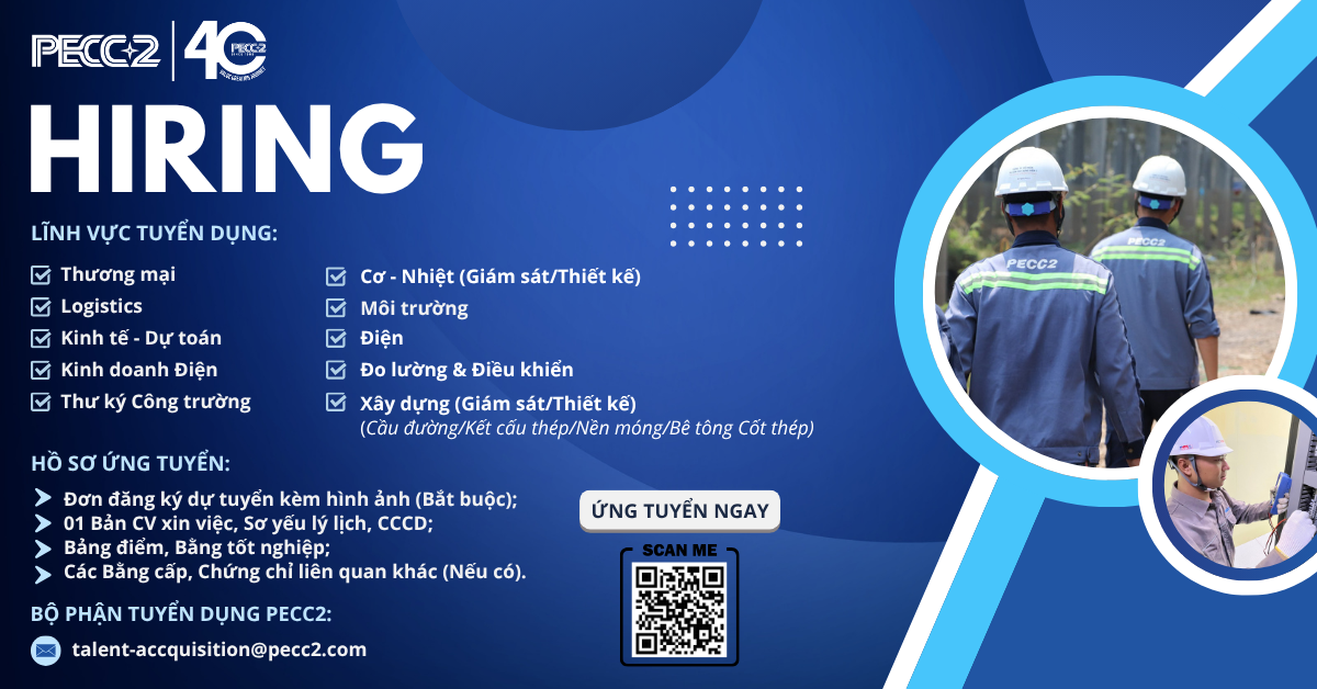 Gia nhập PECC2 - nơi bạn có thể góp sức vào những công trình quy mô, đồng hành cùng đội ngũ chuyên nghiệp trong lĩnh vực năng lượng.