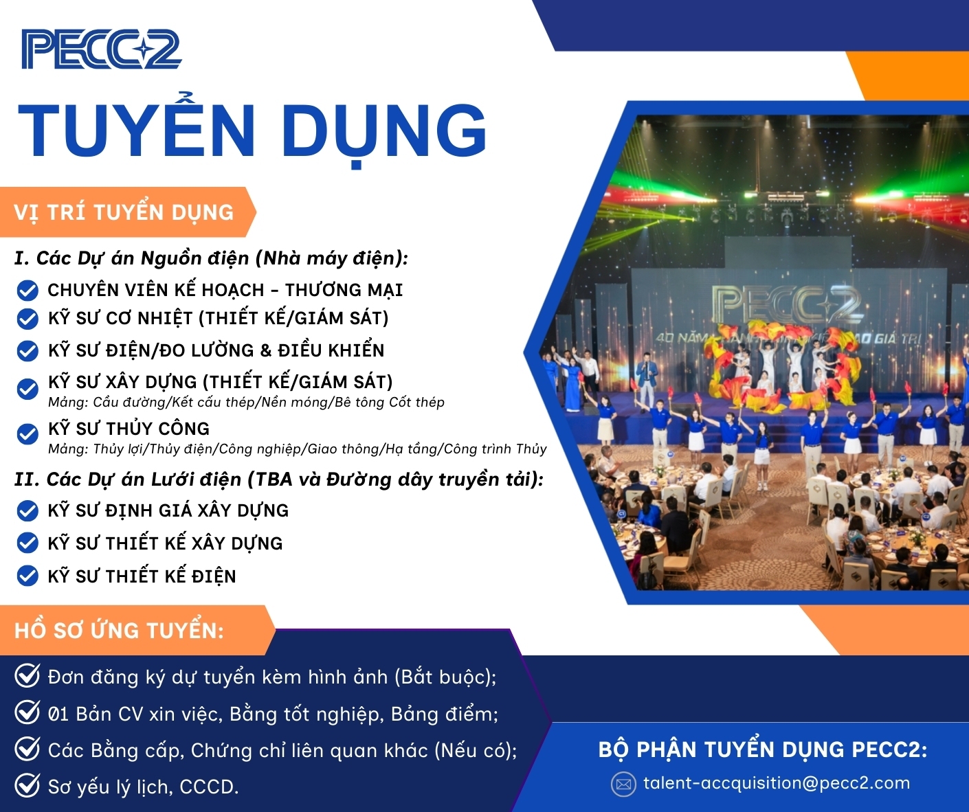 Với đội ngũ hơn 40 năm kinh nghiệm trong lĩnh vực tư vấn năng lượng, PECC2 hướng đến xây dựng môi trường làm việc chuyên nghiệp, nơi mỗi kỹ sư có thể phát huy chuyên môn và phát triển bền vững cùng doanh nghiệp. Chúng tôi tin rằng, sức mạnh của PECC2 nằm ở Con người - Những người dám nghĩ, dám làm và luôn hướng tới sự khác biệt. Cùng chúng tôi viết tiếp câu chuyện phát triển bền vững bằng Tri thức, Công nghệ và Khát vọng Đổi mới!